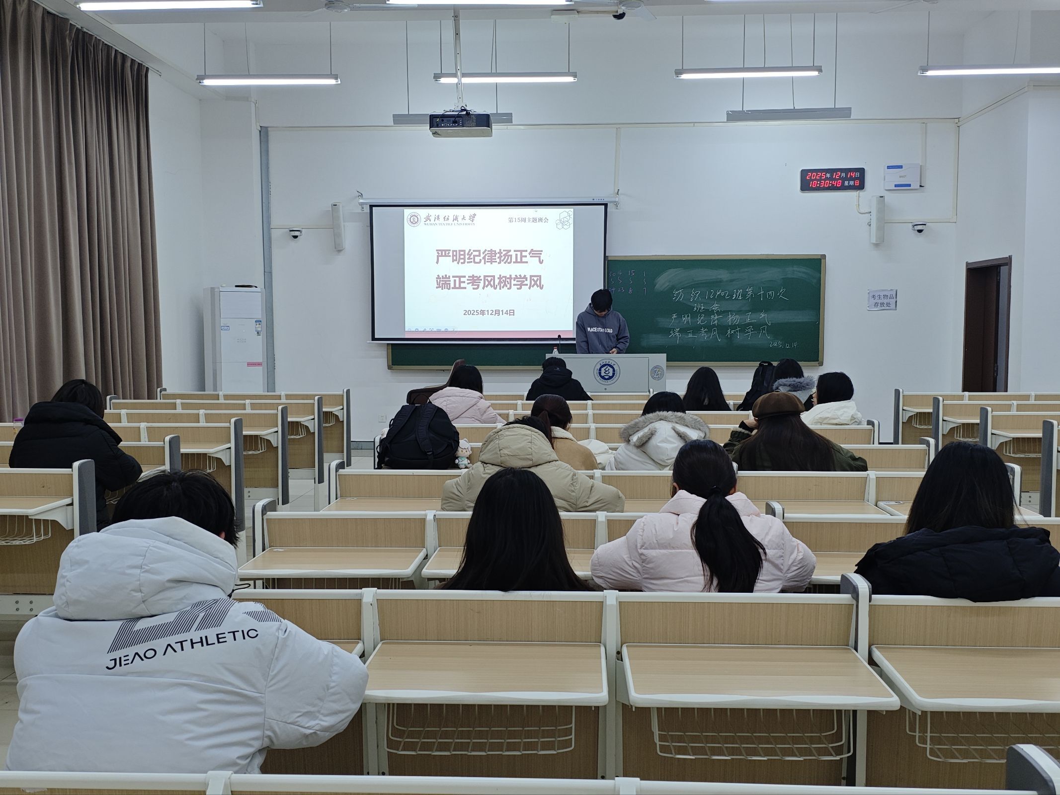 组织各班级开展“严明纪律扬正气,端正考风树学风”主题班会。各班辅导员、班主任主持班会,全体本科生共同参与。