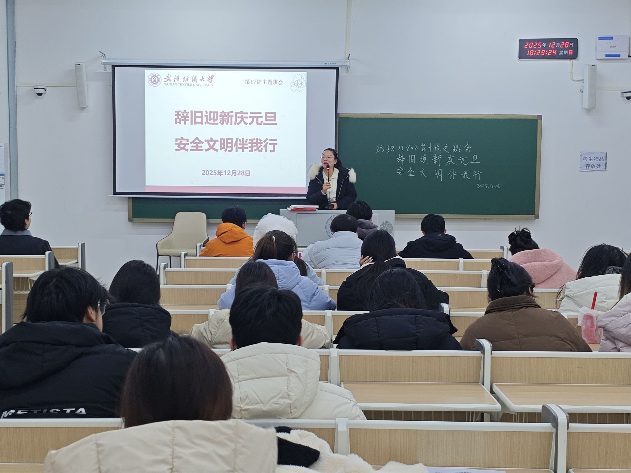 组织开展“辞旧迎新庆元旦,安全文明伴我行”主题班会活动。各年级辅导员,班主任主持班会,全体学生共同参与。